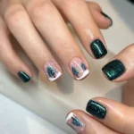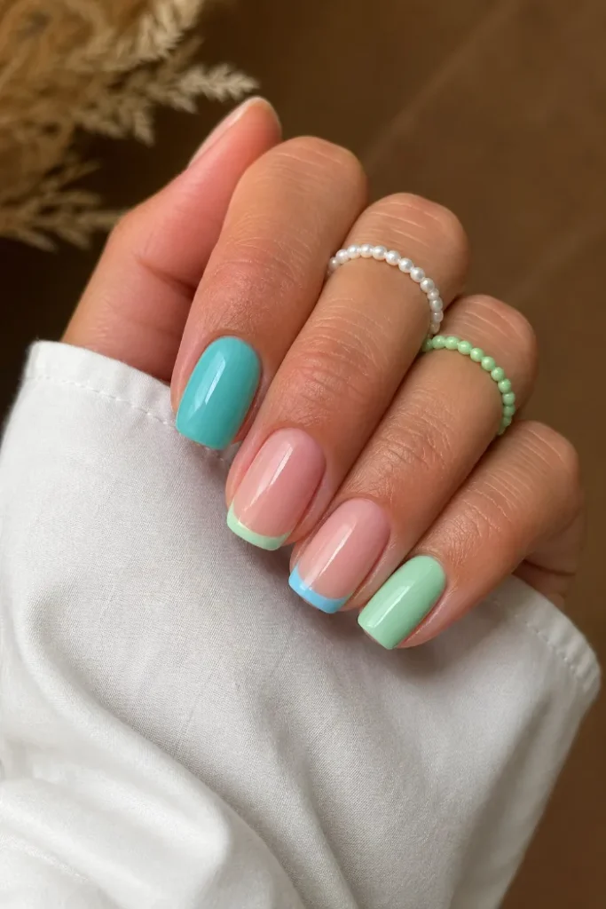 This short nail set uses mint green, aqua blue, and soft French tips for a cool summer mix. The sheer base keeps the manicure light, while the solid color nails add balance. It feels fresh without needing extra art or glitter.