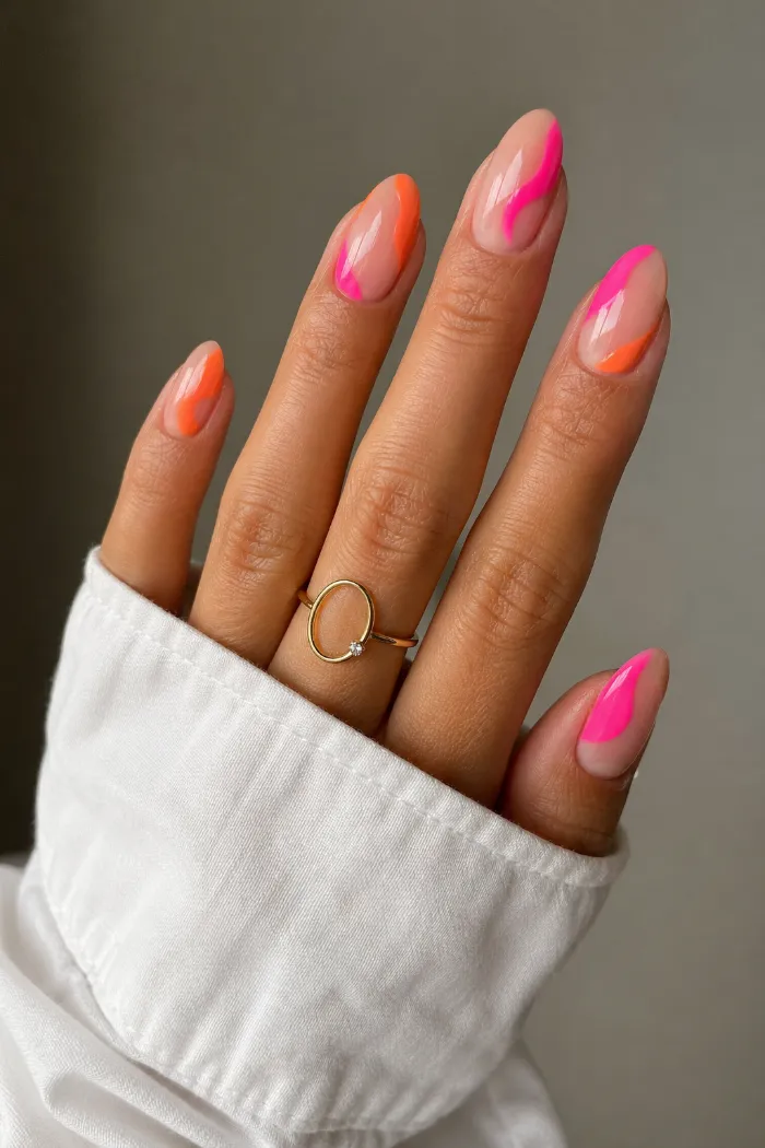 This set keeps the base natural, then adds bright pink and orange swirls across each nail. The curved placement gives the color movement without covering the whole nail, which makes it a fun choice if you want something bright but still clean.