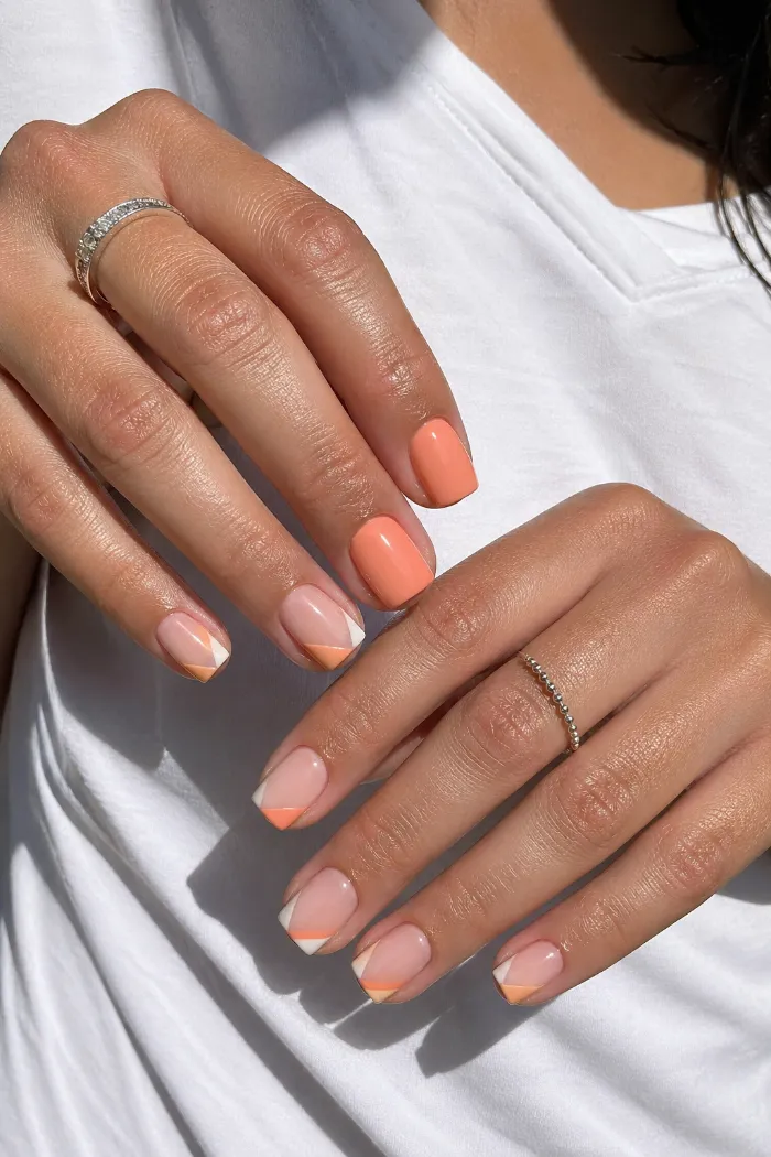 These short square nails use peach polish with angled white and peach French details on a sheer base. The lines are simple, but the diagonal placement makes the manicure feel more interesting. It is a good choice for clean summer nails with color.