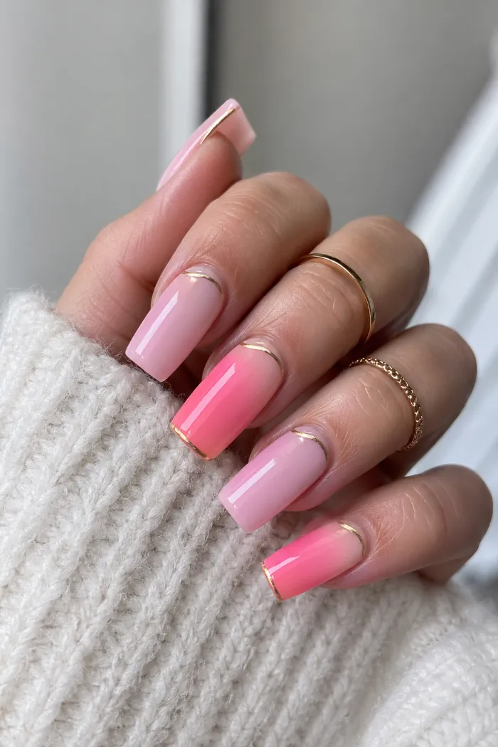 16. Pink Ombre Square Nails with Gold Lines