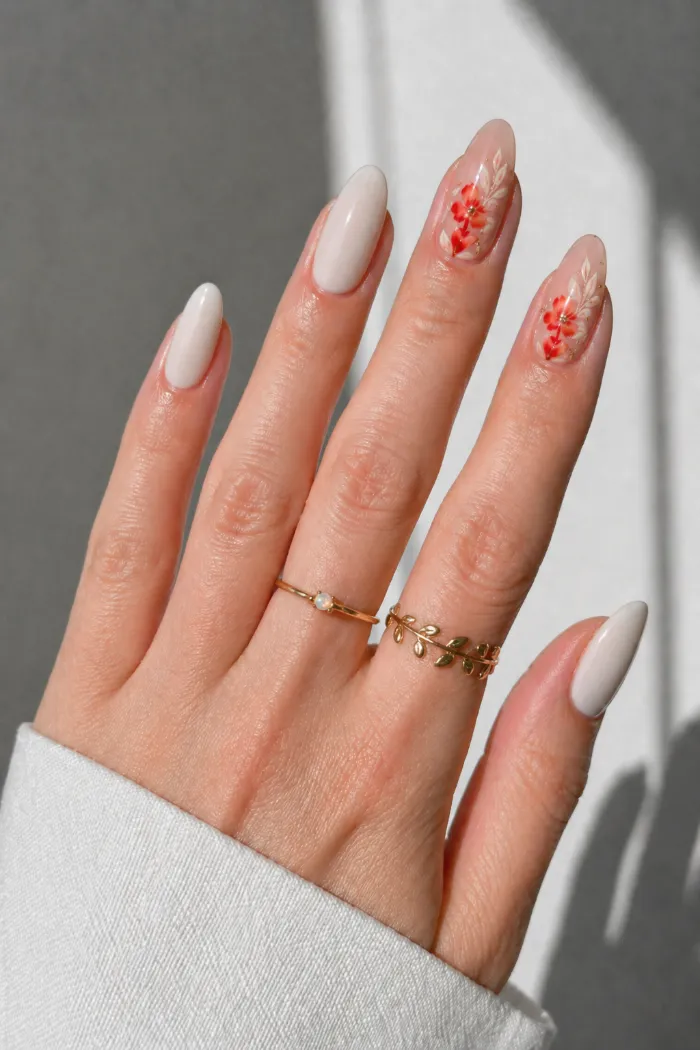 12. White Almond Nails with Floral Accent Art
