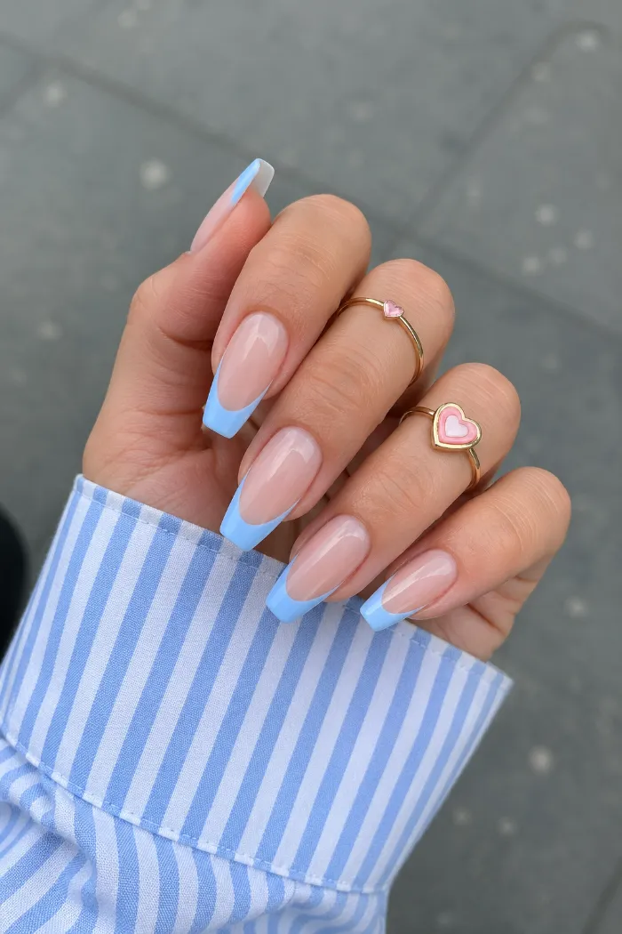 These square nails use a sheer pink base with soft blue French tips, giving the manicure a fresh June feel. The clean tip shape keeps it neat, while the blue makes it lighter and more playful than a classic white French manicure.