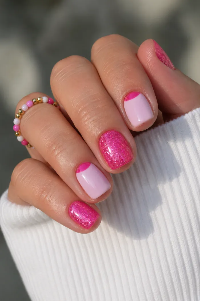 This short manicure mixes glossy pale pink with bright pink glitter and curved half moon details. The glitter gives the set a fun summer feel, while the soft base keeps it from looking too loud. It is playful but still easy to wear.