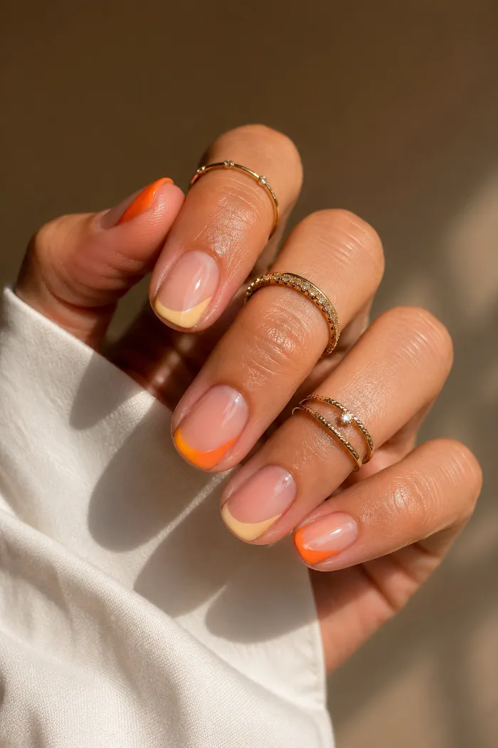 These rounded nails use orange and butter yellow French tips over a sheer pink base. The colors feel warm and sunny, but the thin curved tips keep the design neat. It is a simple way to wear brighter shades without full-color nails.