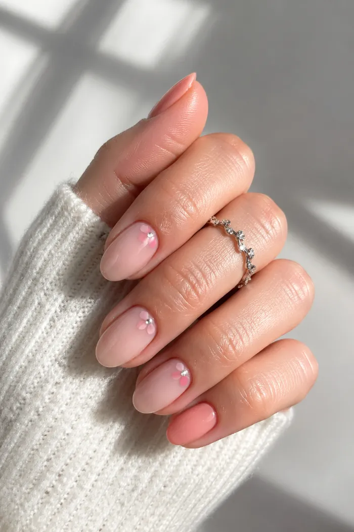 15. Soft Pink Almond Nails with Tiny Flowers