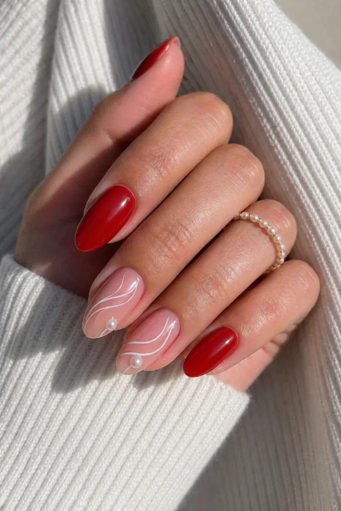 8. Red Almond Nails with Sheer Pearl Accents