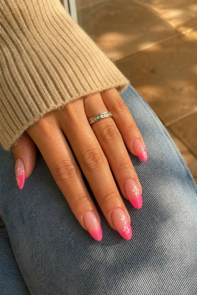 This pink ombre manicure fades from a sheer base into brighter tips, then adds small white flowers for a soft summer detail. The almond shape keeps the nails feminine, while the floral accents make the design feel sweet without becoming too busy.