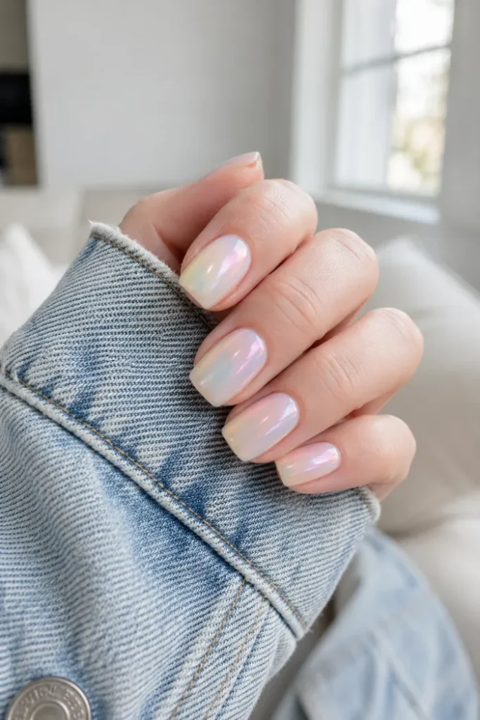These short nails have a sheer pearl finish with a soft shift of pink, cream, and pale blue. The look is simple, but the glow gives it more dimension. It works well if you want June nails that feel fresh and low effort.