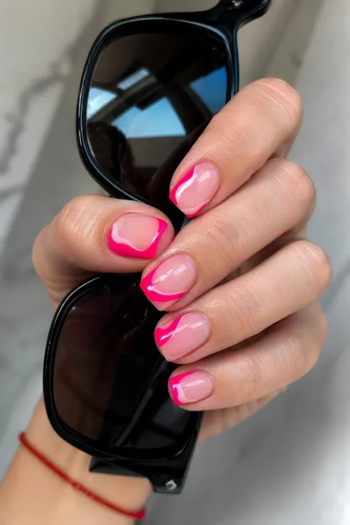 These short nails use glossy hot pink swirls over a sheer base, giving the manicure a bright but simple look. The curved lines make the design feel fresh, while the shorter length keeps it practical for everyday wear in June.