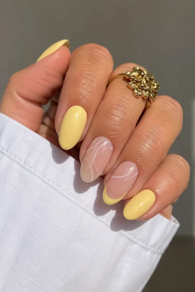 6. Yellow Almond Nails with Sheer Line Art