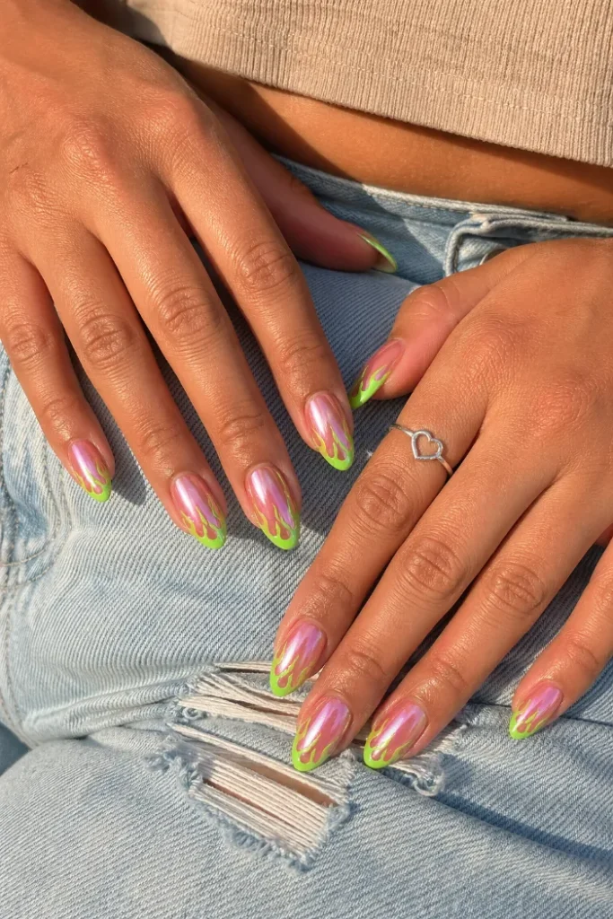 This manicure has a pink chrome base with bright green flame tips, which gives the nails a playful summer edge. The glossy finish keeps the design smooth, while the flame detail adds just enough contrast to make the set feel more fun.