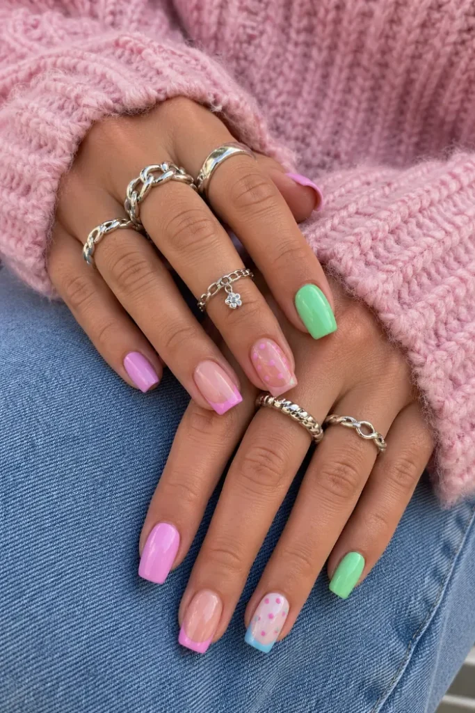 This pastel set mixes soft purple, mint green, pink French tips, and dotted accent nails. It feels cheerful without relying on one single color. The shorter square shape also keeps the design wearable, especially if you like playful nails that still feel tidy.