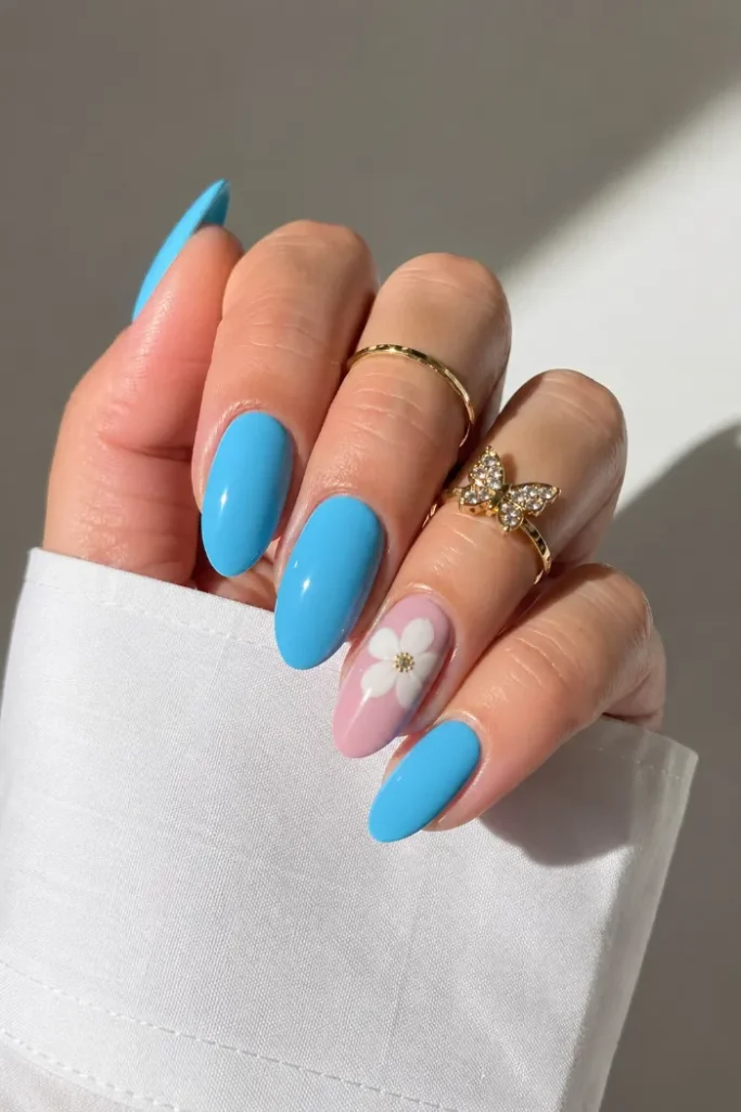 This blue almond manicure keeps most nails solid and glossy, then adds one sheer accent nail with a white daisy. The single floral detail makes the set feel summery without adding too much pattern. It is bright, clean, and easy to understand.