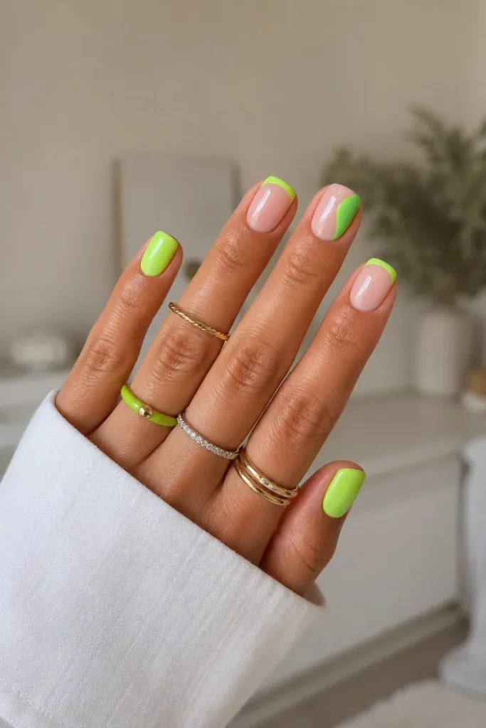 This lime green manicure mixes solid color nails with curved French tips on a sheer base. The bright shade feels right for June, but the open space keeps the design from feeling too heavy. It is a fun choice for short summer nails.