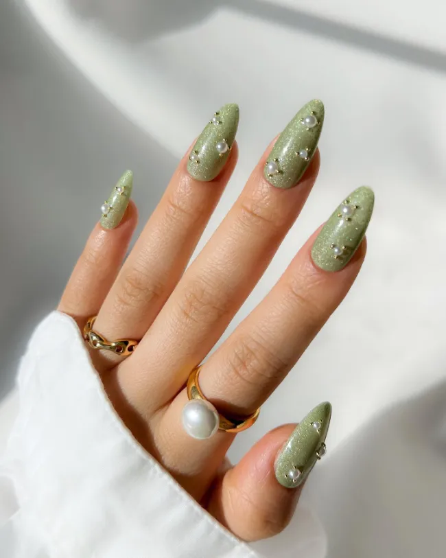 Glitter green nails instantly give off cozy, festive energy for fall, and when paired with pearl studs, they’re totally elevated.