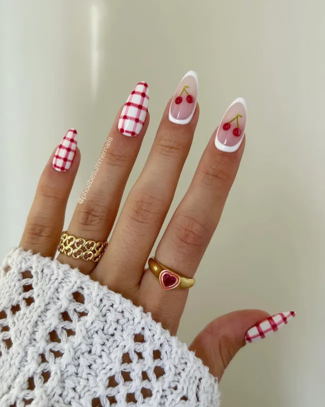 How cute are these? Pink and red gingham nails already have that cozy, vintage feel, but the little cherry accents take them to the next level.