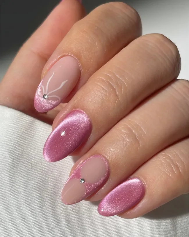 Cat-eye nails are already mesmerizing, but make them pink and add bows with rhinestones? Instant showstopper.