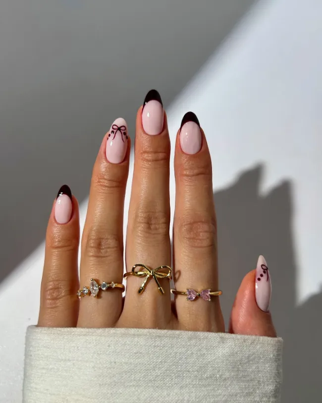 Classic with a twist, black French tips on almond nails are already timeless, but adding bow and dot accents makes them irresistibly chic.