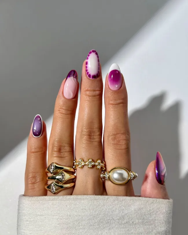 A dreamy swirl of purple and pink on almond nails creates a playful tie-dye effect that feels youthful and fun.