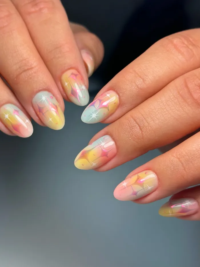 These pastel aura nails look like a dreamy watercolor painting, with soft blends of pink, yellow, and blue topped with delicate starbursts. They give off an ethereal vibe that feels both calming and playful. Perfect for spring days or anytime you want your nails to shine with celestial magic.