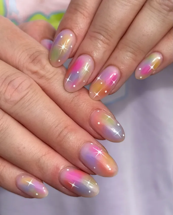 Bring the rainbow to your fingertips with this luminous aura design. The seamless fade of pink, orange, green, and purple hues creates a stunning soft-focus effect, while dainty sparkles add just the right touch of glow. These nails radiate positivity and style effortlessly.