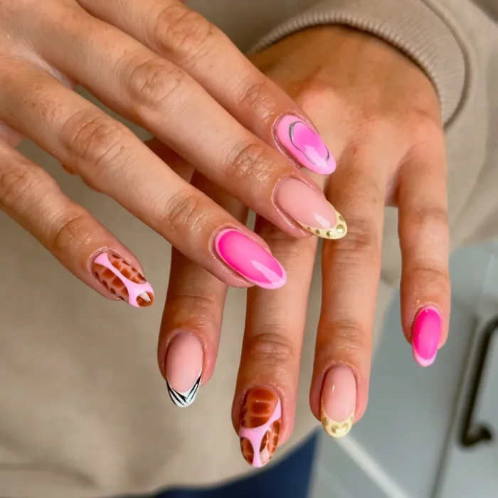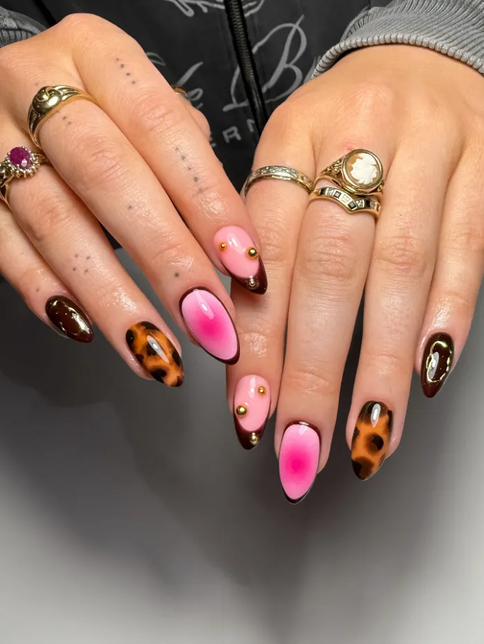 Dark brown leopard accents meet glowing pink auras for this fiery design. The contrast between the wild animal pattern and feminine gradients makes these nails a total statement. They’re daring, trendy, and perfect for when you want your manicure to stand out.