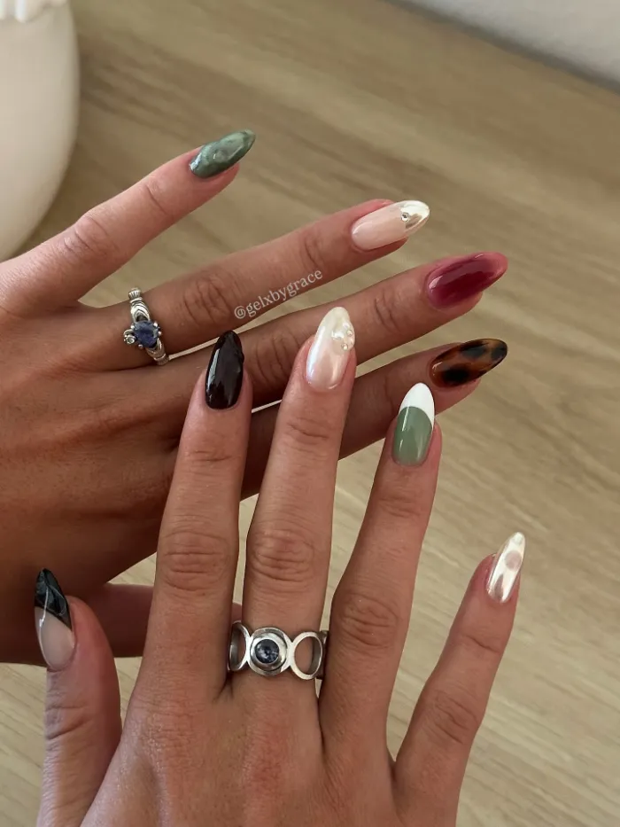 From pearl white to mossy green and rich burgundy, this aura mix is perfect for lovers of eclectic styles. Each nail tells its own story, creating a beautiful mismatch look that feels fresh and artistic. A creative option if you adore variety in your sets.