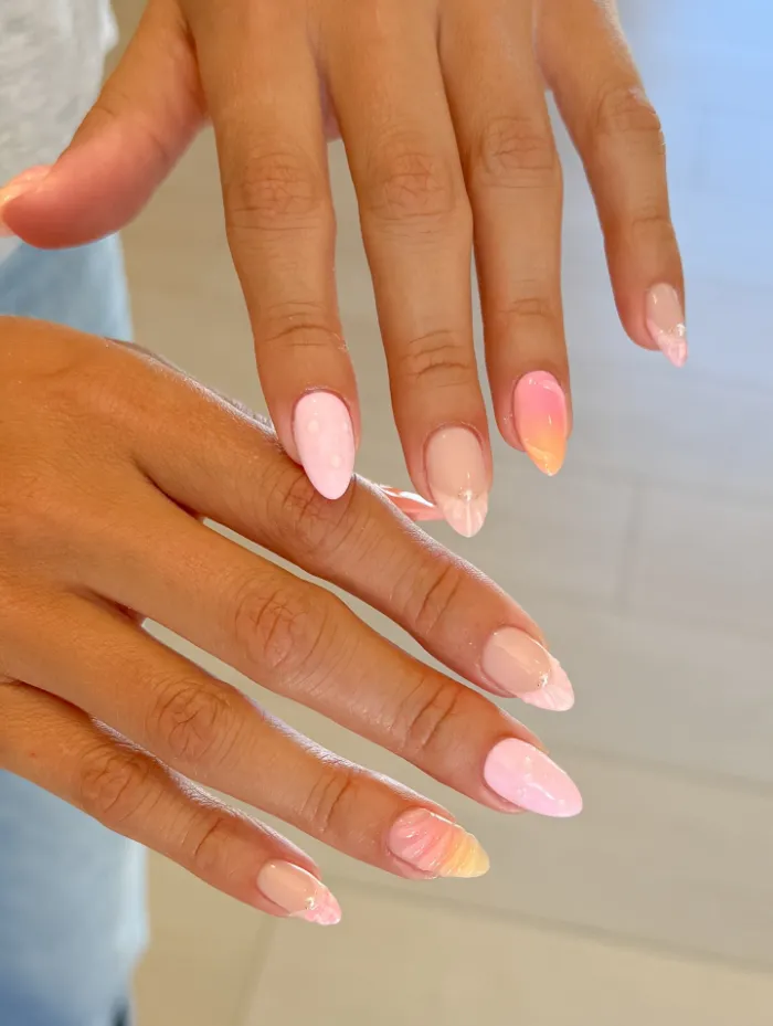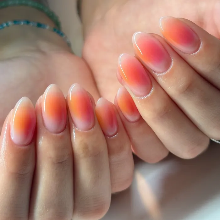 Delicate pink and peach gradients melt seamlessly together, creating an understated aura look. These nails are subtle yet gorgeous, ideal for a romantic vibe or a more polished, everyday style. They pair effortlessly with light outfits and minimal gold jewelry.