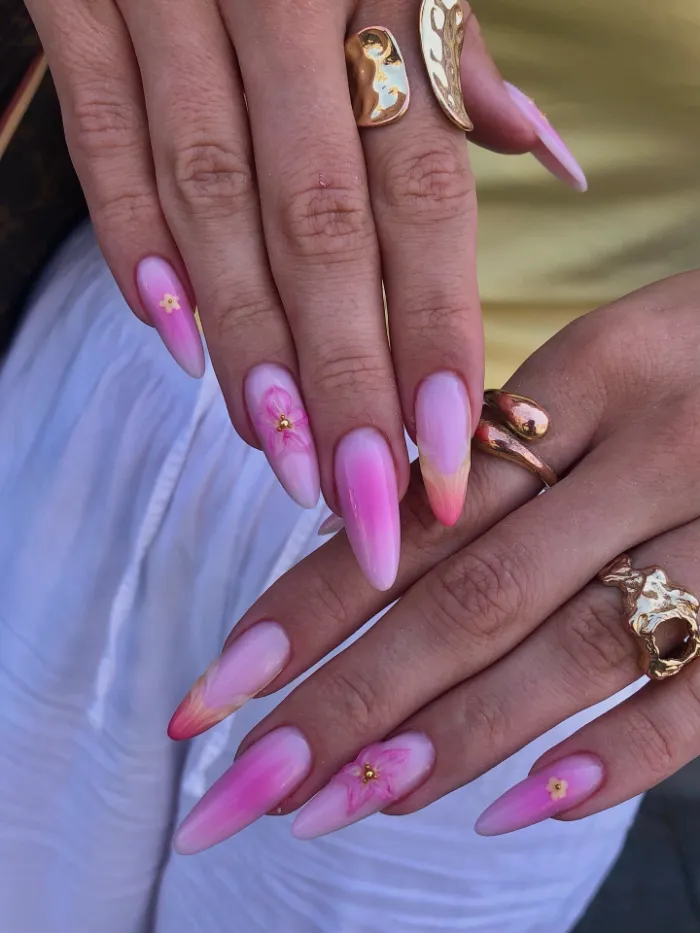 Turn up the charm with a pink aura fade featuring tiny golden floral accents. These nails mix elegance with whimsy, making them the perfect choice for spring or summer. The glow feels feminine yet playful, with a touch of sweet garden-inspired energy.