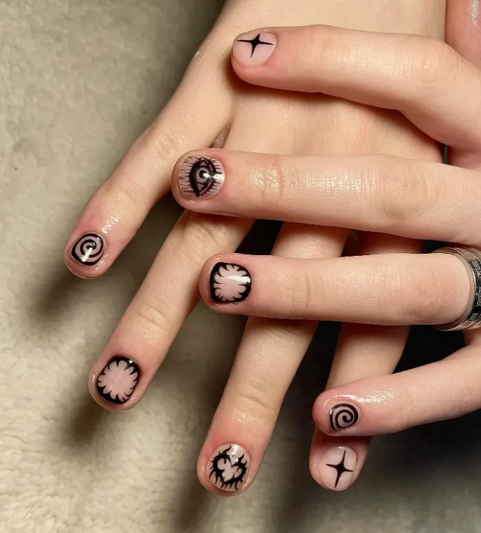 These nails take a different spin with bold black aura designs over a nude base. Abstract shapes like swirls, stars, and even an eye motif give the set a mysterious, artsy feel. Perfect for anyone who loves edgy, creative vibes.