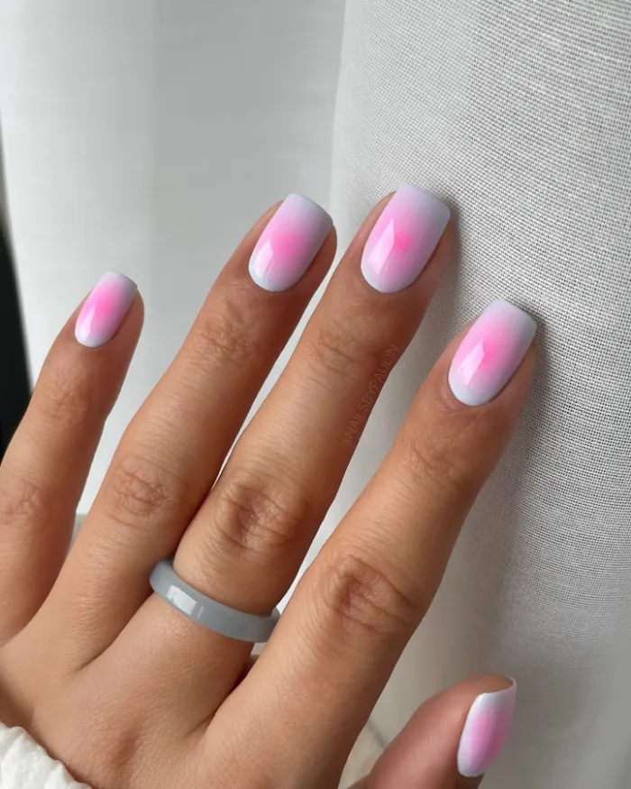 Soft and simple never looked so chic. These short aura nails blend pink into lavender and white, creating a minimal yet glowing effect. It’s an everyday-friendly manicure that still feels stylish, especially for those who love keeping their nails short.