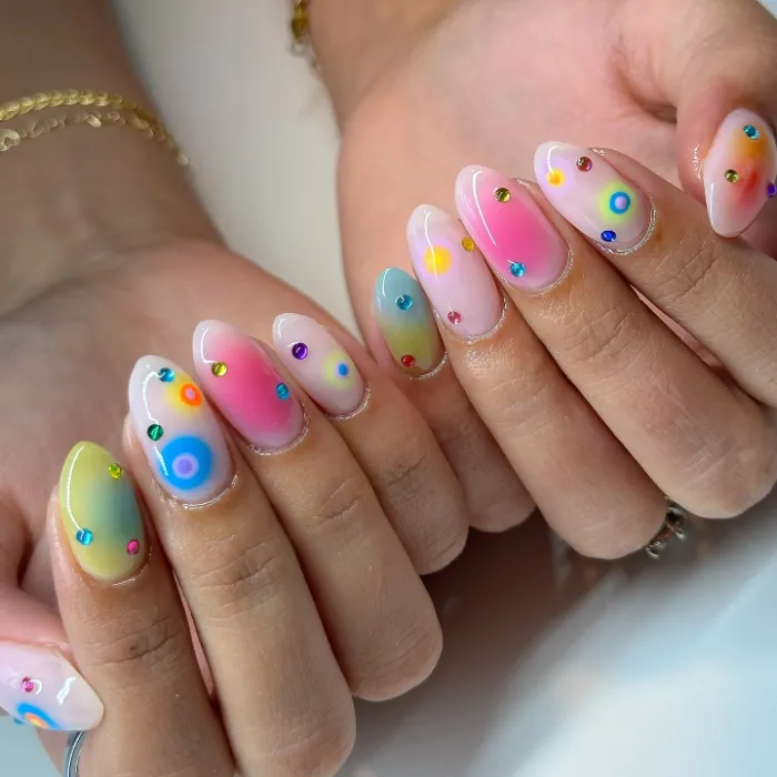 Bright aura gradients in pink, green, and blue pop even more with tiny rhinestone embellishments. Each nail looks like a glowing bubble of color, giving your hands a fun, playful vibe. Perfect for anyone who loves adding a little sparkle to their style.
