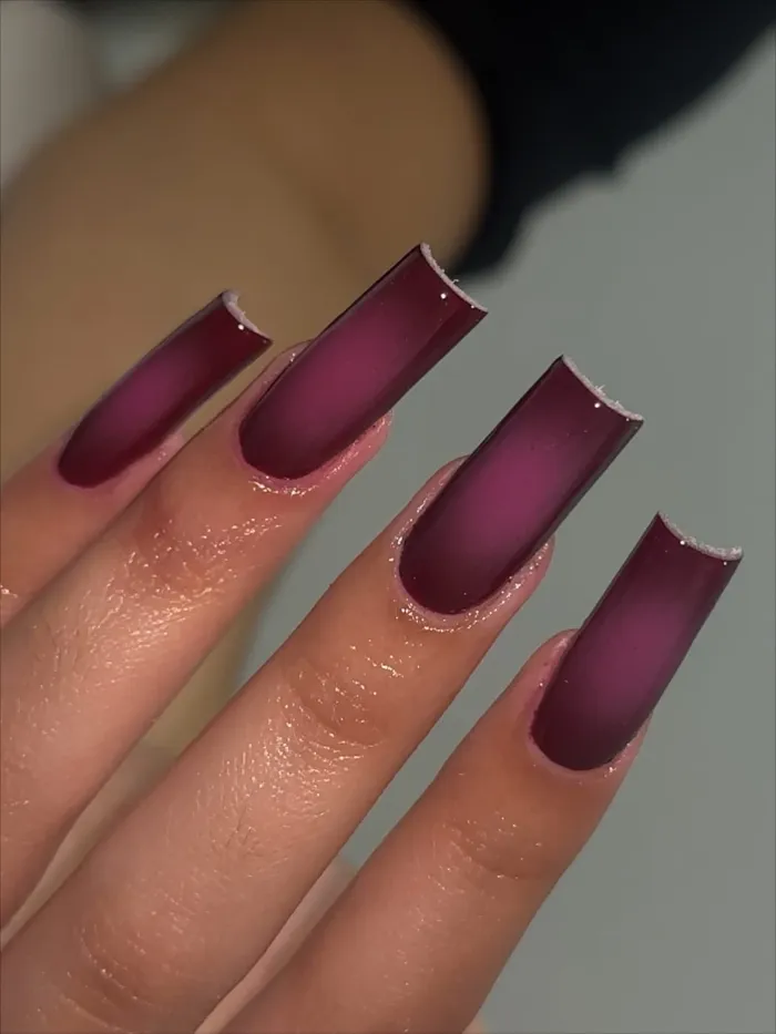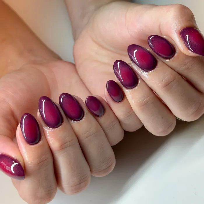 Rich plum shades fade into softer berry tones for a sultry, sophisticated aura look. The glossy finish enhances the depth, making this manicure ideal for fall or winter. It’s elegant, mysterious, and perfect for when you want your nails to feel luxurious.