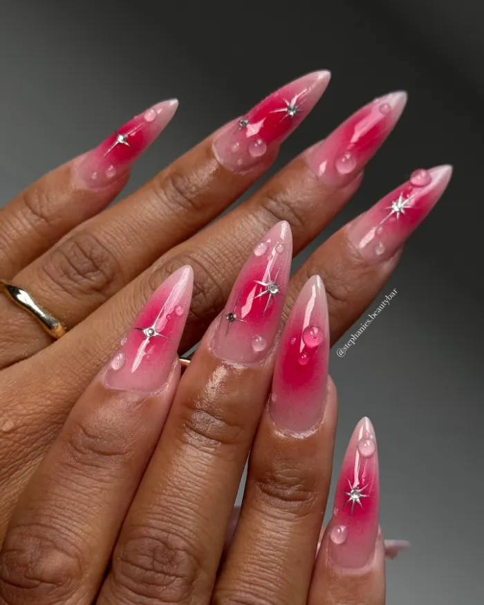 This vivid aura manicure stands out with a neon pink glow and 3D droplet accents that mimic fresh rain. Tiny starbursts and gems add an extra magical touch. It’s bold, trendy, and perfect for when you want nails that shine bright.