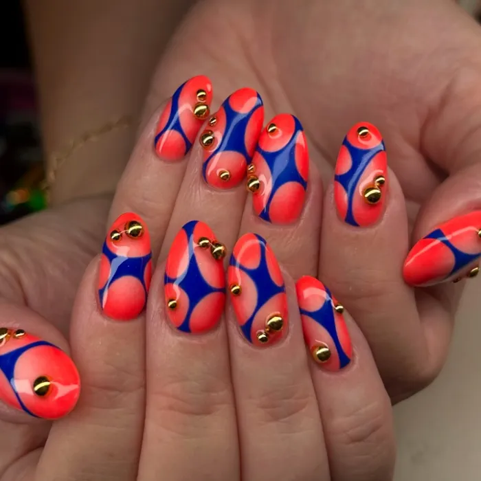 Bright coral-red aura nails get a retro makeover with electric blue accents and gold studs.