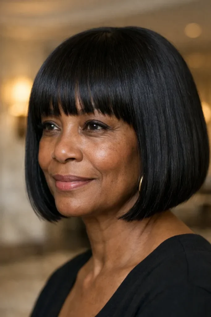 Deep black looks especially polished in a blunt bob. If you like highlights, keep them blended and soft so the grow-out is not stressful.