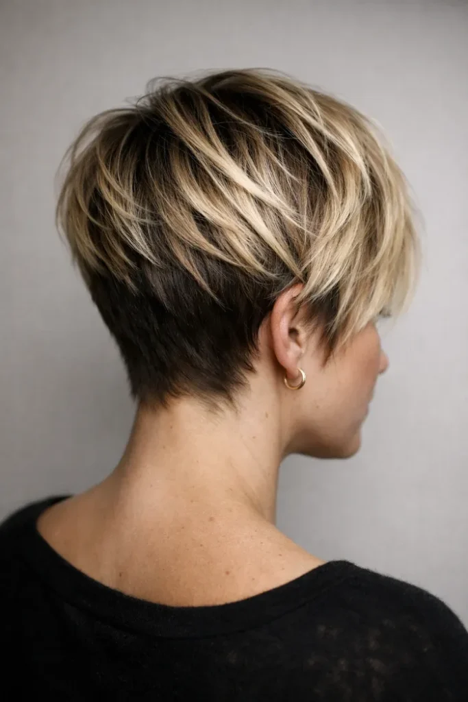 Blonde balayage adds lightness through the top layers of this pixie, creating contrast without losing depth at the roots.