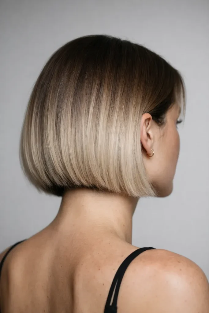 Because the line is sharp, the soft color transition prevents the bob from looking too heavy or severe.