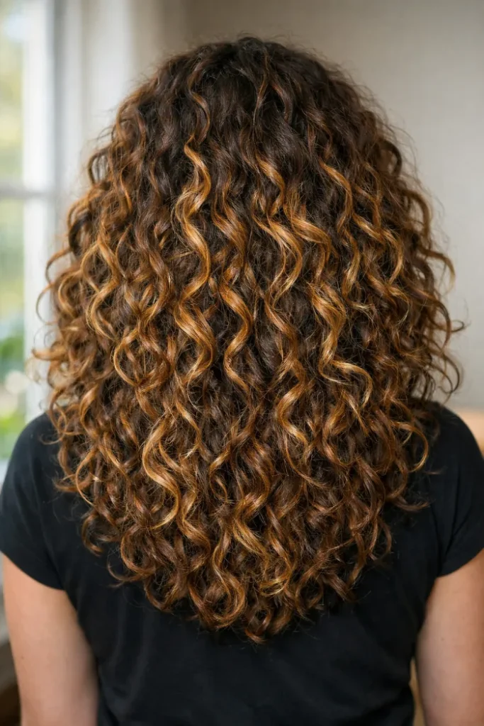 Caramel highlights are placed to follow the curl pattern, which keeps the color from looking patchy or forced. Each curl catches light differently.
