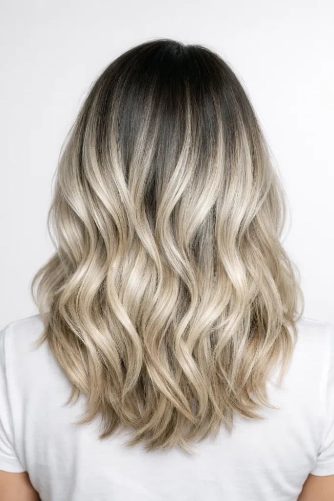 This look blends a cool ash blonde through the mid-lengths, keeping the darker base visible at the roots. The contrast feels natural rather than sharp.