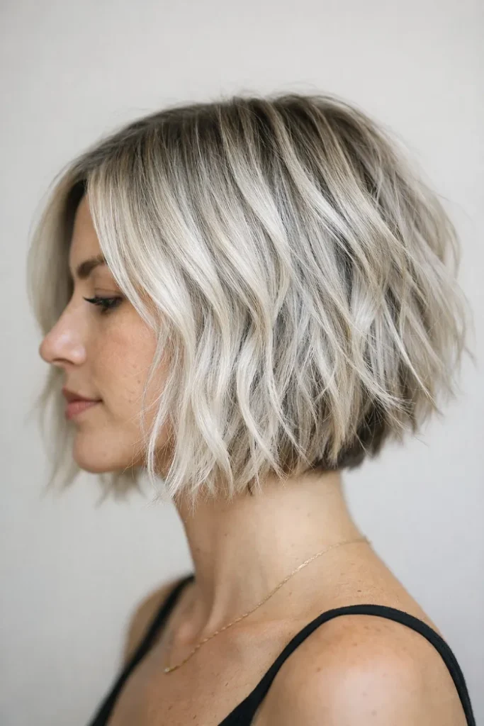 This bob uses soft waves to break up the color, allowing the blonde to blend naturally into the brown base. The result feels balanced and controlled.