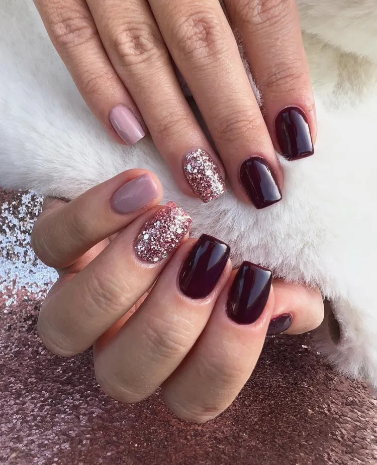 This manicure blends deep burgundy polish with sparkling rose-gold glitter accents. The mix of shimmer and rich tones creates a luxurious look, ideal for the holiday season or anytime you want your nails to steal the spotlight.