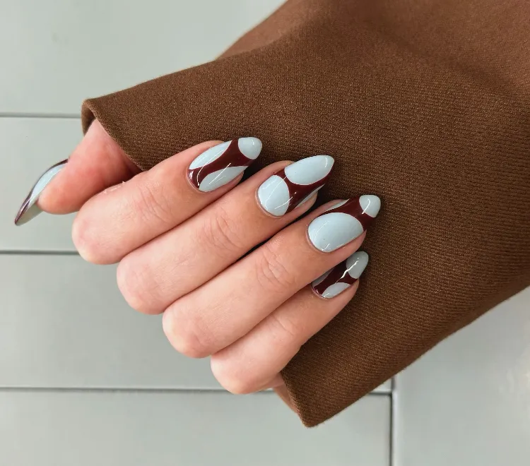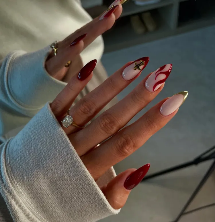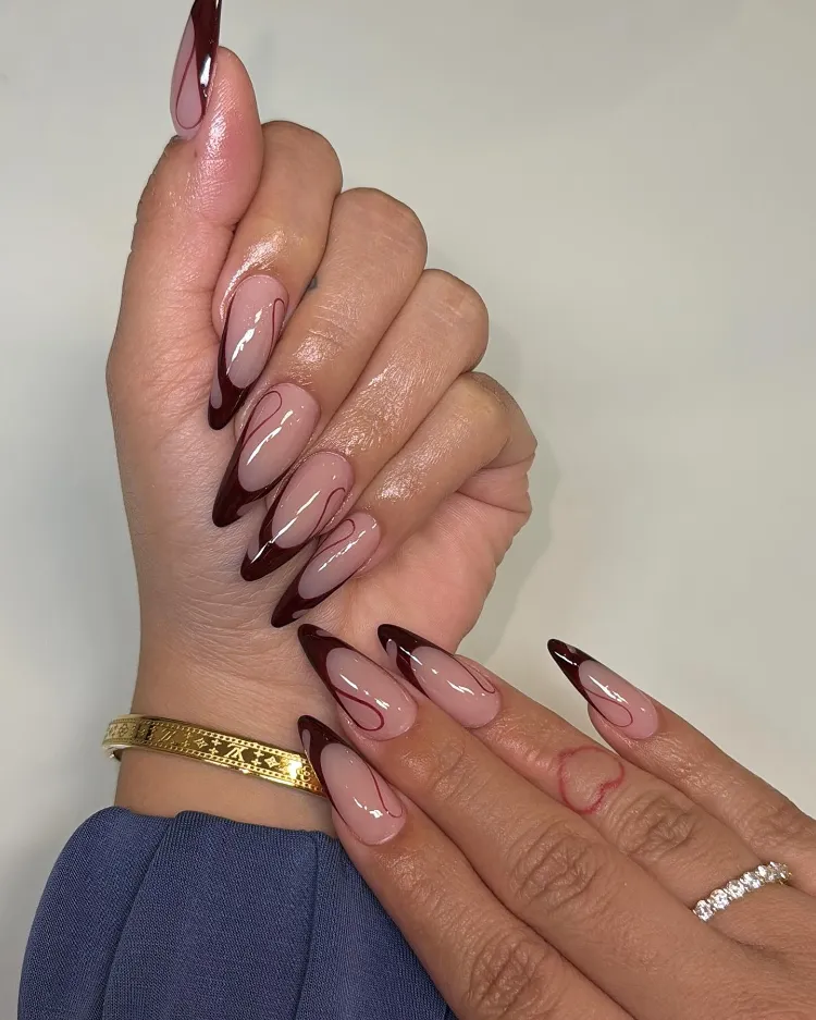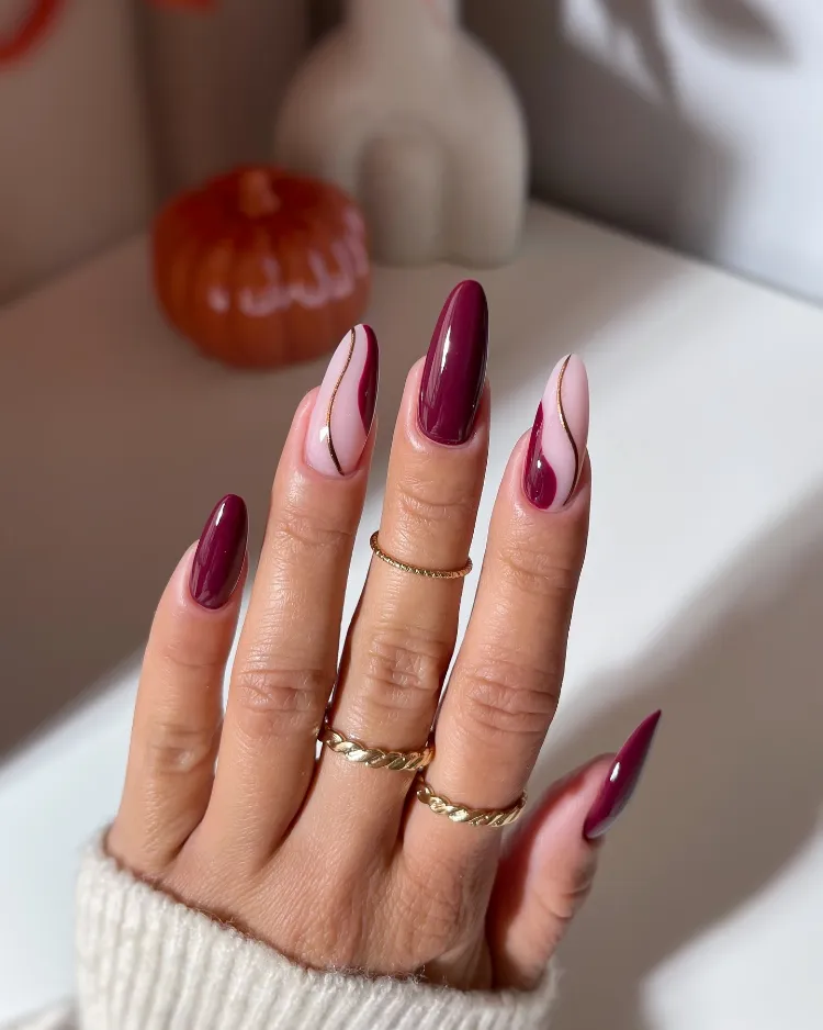 This manicure blends glossy burgundy with soft nude bases and swirling abstract lines. The design feels modern yet chic, offering just the right amount of drama. Perfect for cozy fall days or evenings out with a stylish twist.