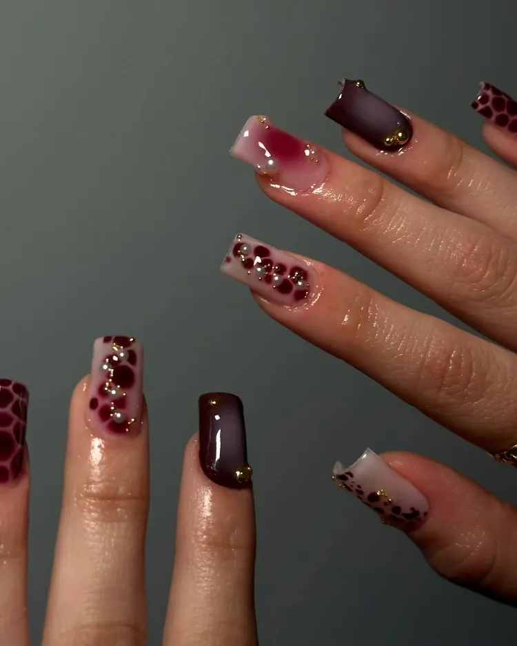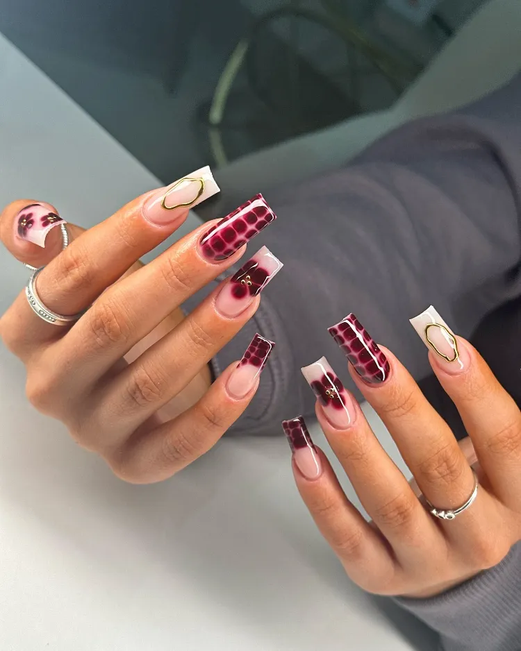 With a mix of aura gradients, bold burgundy accents, and abstract patterns, this manicure feels bold and artsy. It’s perfect for nail lovers who enjoy trying unique designs that balance creativity with elegance.