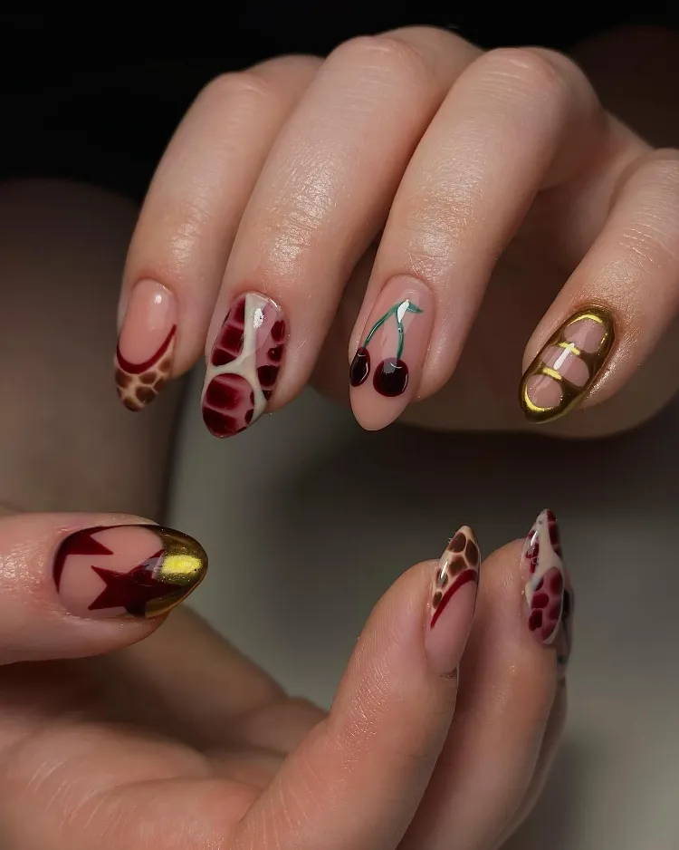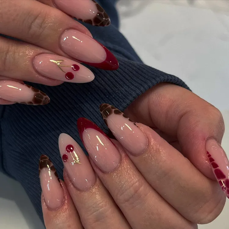 This unique design mixes burgundy tips with a hint of animal print and cherry nail art. The combination of playful and bold makes these nails unforgettable, ideal for anyone looking to stand out with a statement manicure.