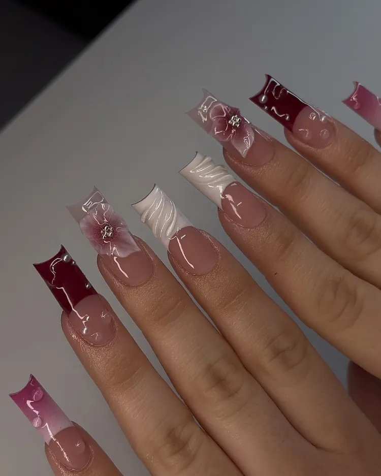 Mixing swirls, floral bursts, and sleek French tips, this design proves burgundy nails can be endlessly creative. The glossy finish enhances the details, giving your manicure a bold yet wearable edge. Perfect for anyone who wants artsy nails with a chic twist.