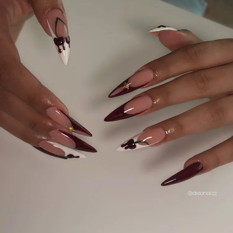 Sharp stiletto nails become playful with a mix of burgundy, crisp white, and tiny cherry details. The look balances elegance with fun, making it perfect for those who want nails that are both trendy and full of personality.