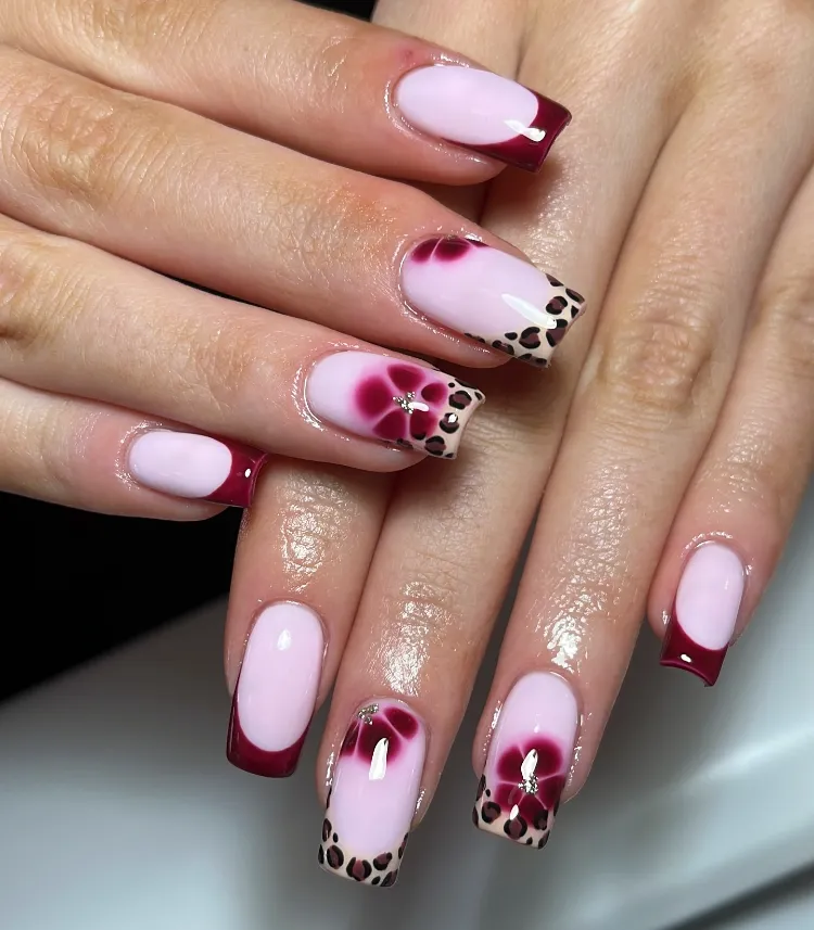 This set pairs a soft pink base with burgundy tips and leopard accents, proving burgundy nails can be fierce and stylish. The animal print adds just the right edge, while the glossy finish keeps everything looking chic and polished.