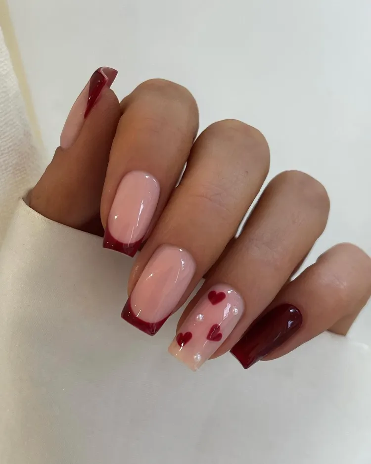 A sweet take on burgundy nails, this set pairs crisp French tips with dainty heart details. It’s the perfect design for Valentine’s Day or any time you want to add a romantic touch to your nails.