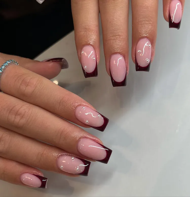 Crisp burgundy French tips get a dreamy upgrade with pearl-like dots on a soft pink base. It’s a minimalist yet elegant style that works beautifully for everyday wear while still feeling elevated and polished.